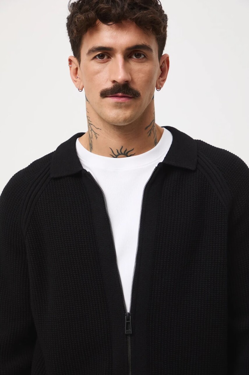 Крій regular. - Довгий рукав-реглан. - Модель з коміром. - Застібається на блискавку. - Оздоблення у вигляді стяжки. - Фактурний матеріал.