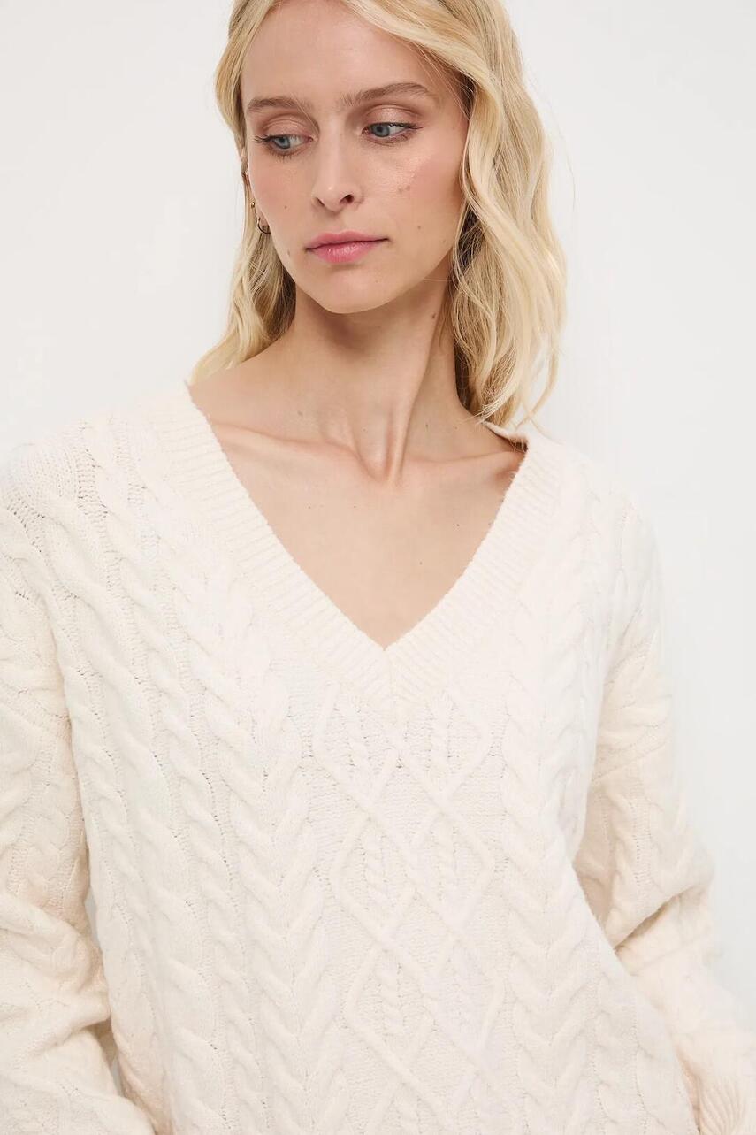 Крій regular. - Довгий рукав. - Занижена лінія плечей. - V-подібний виріз. - Оздоблення у вигляді стяжки. - В'язання "коси". - Трикотаж меланж.
