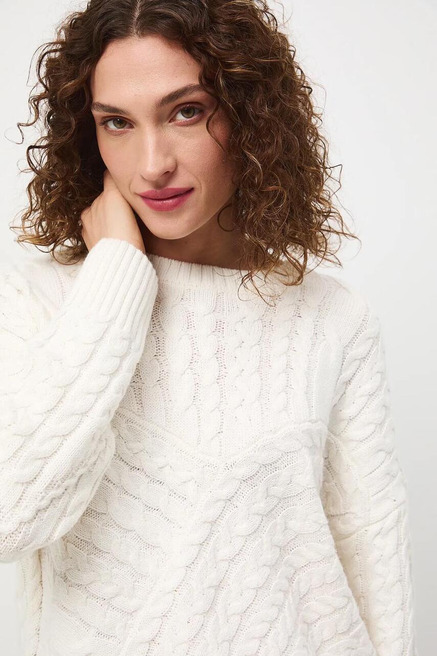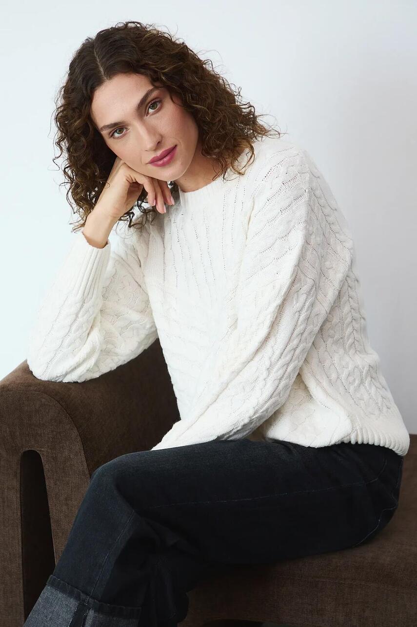 Крій regular. - Довгий рукав. - Занижена лінія плечей. - Круглий виріз. - Оздоблення у вигляді стяжки. - В'язання "коси".
