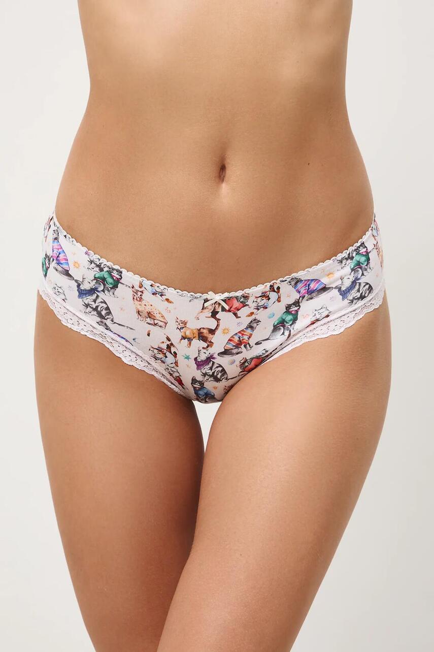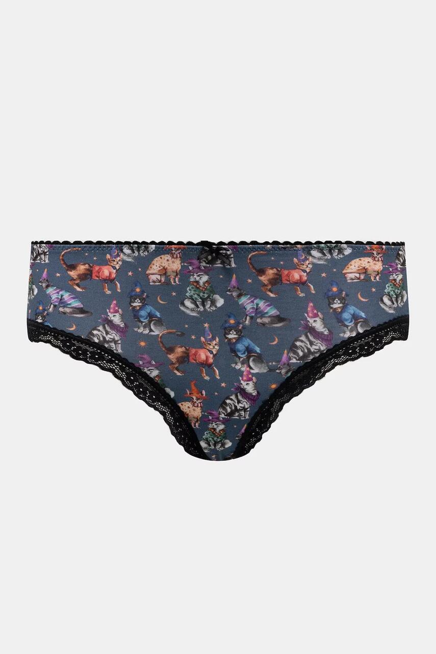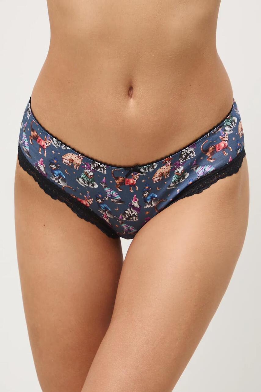 Кількість штук у наборі: 2. - Модель зі звичайною посадкою. - Бавовняна вставка в зоні промежини для більшого комфорту. - Нижні краї оброблені мереживом. - Візерунок у вигляді котів. - Розташування візерунка може відрізнятися на кожному виробі.