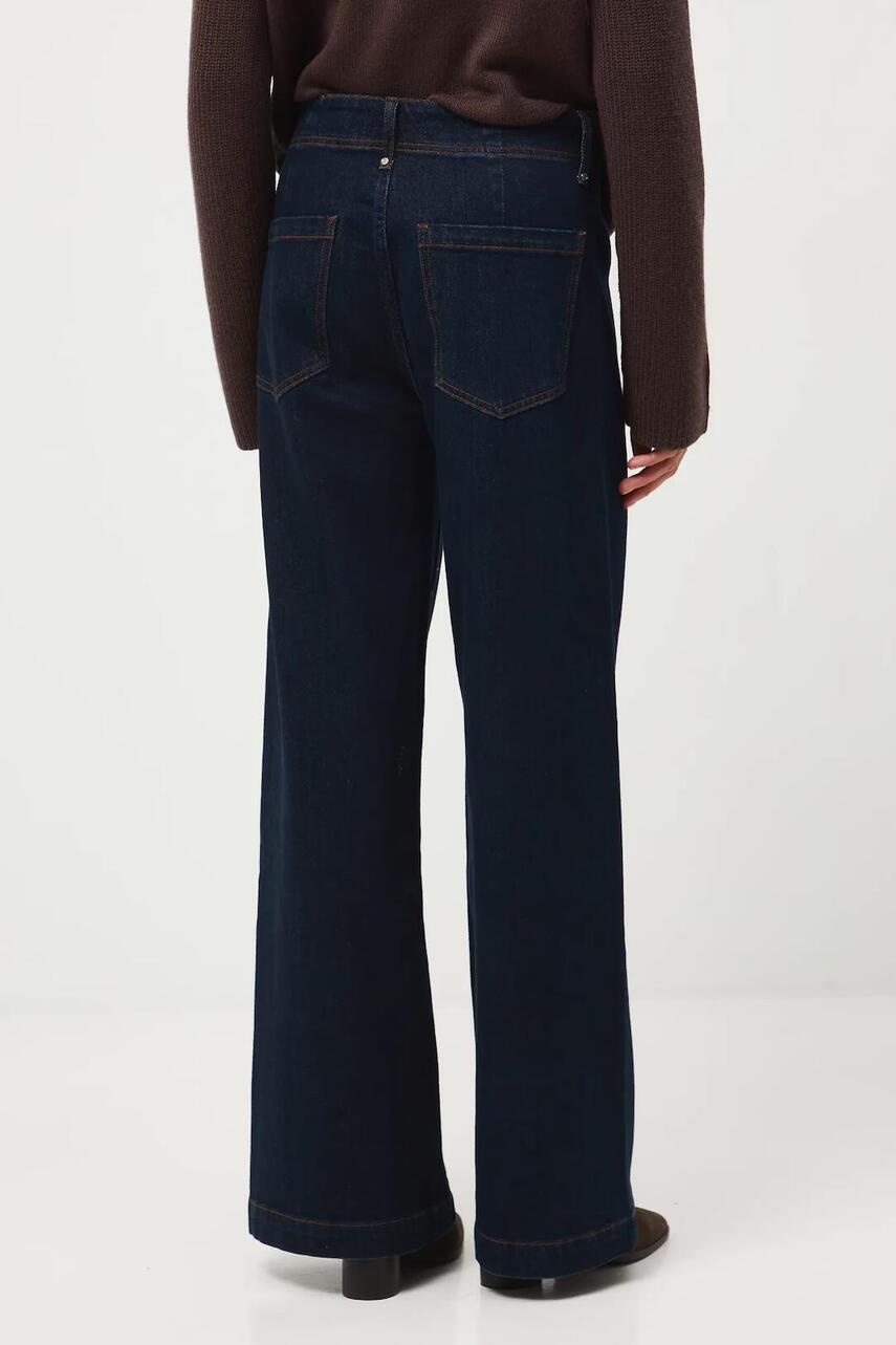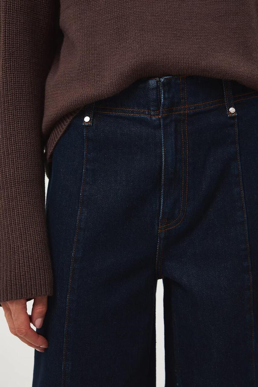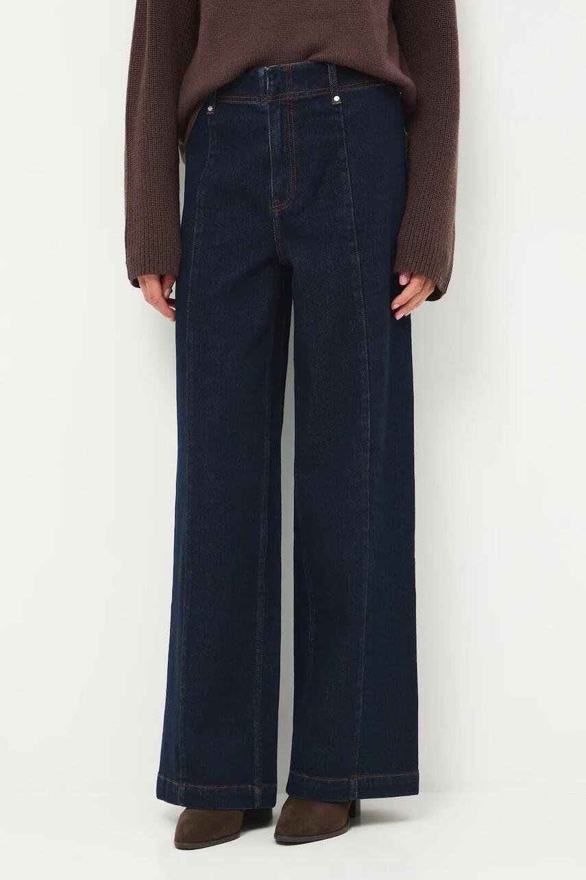 Модель с завышенной талией, застежка на молнию и крючок. - прорезные карманы. - материал с декоративной прошивкой. - контрастные швы. - широкая штанина. - модель выполнена из сырого денима.