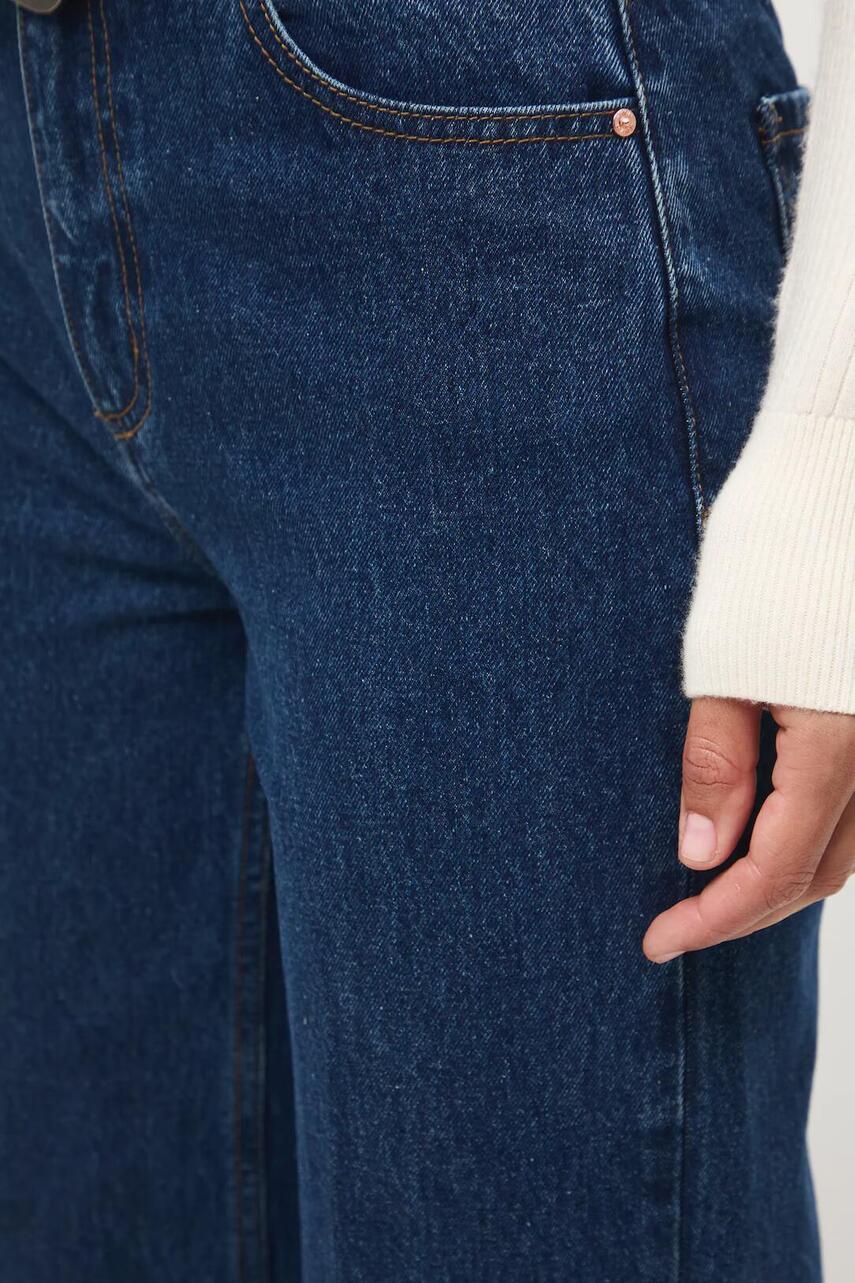 Модель с завышенной талией и застежкой на пуговицы и молнию. - прорезные карманы. - широкая штанина. - деним с декоративными потертостями.