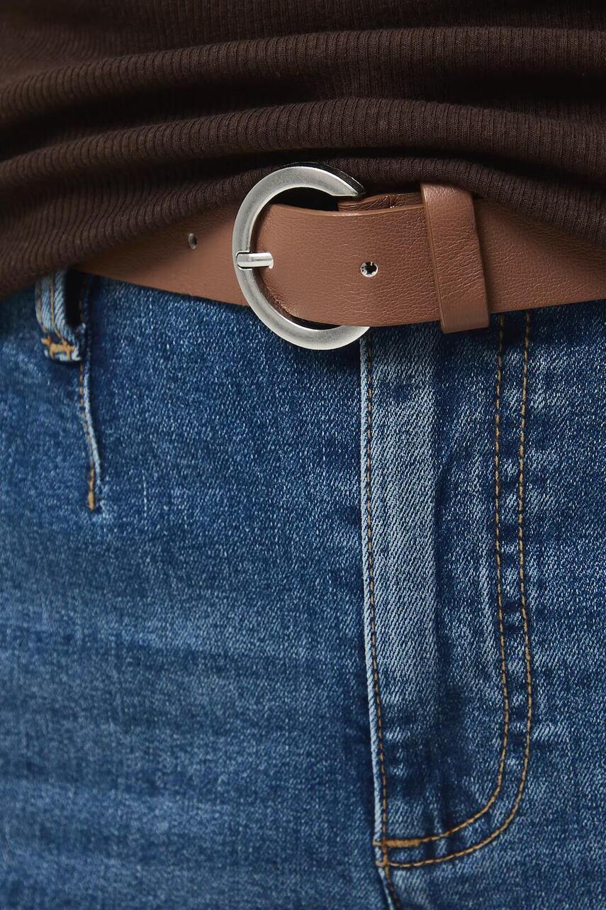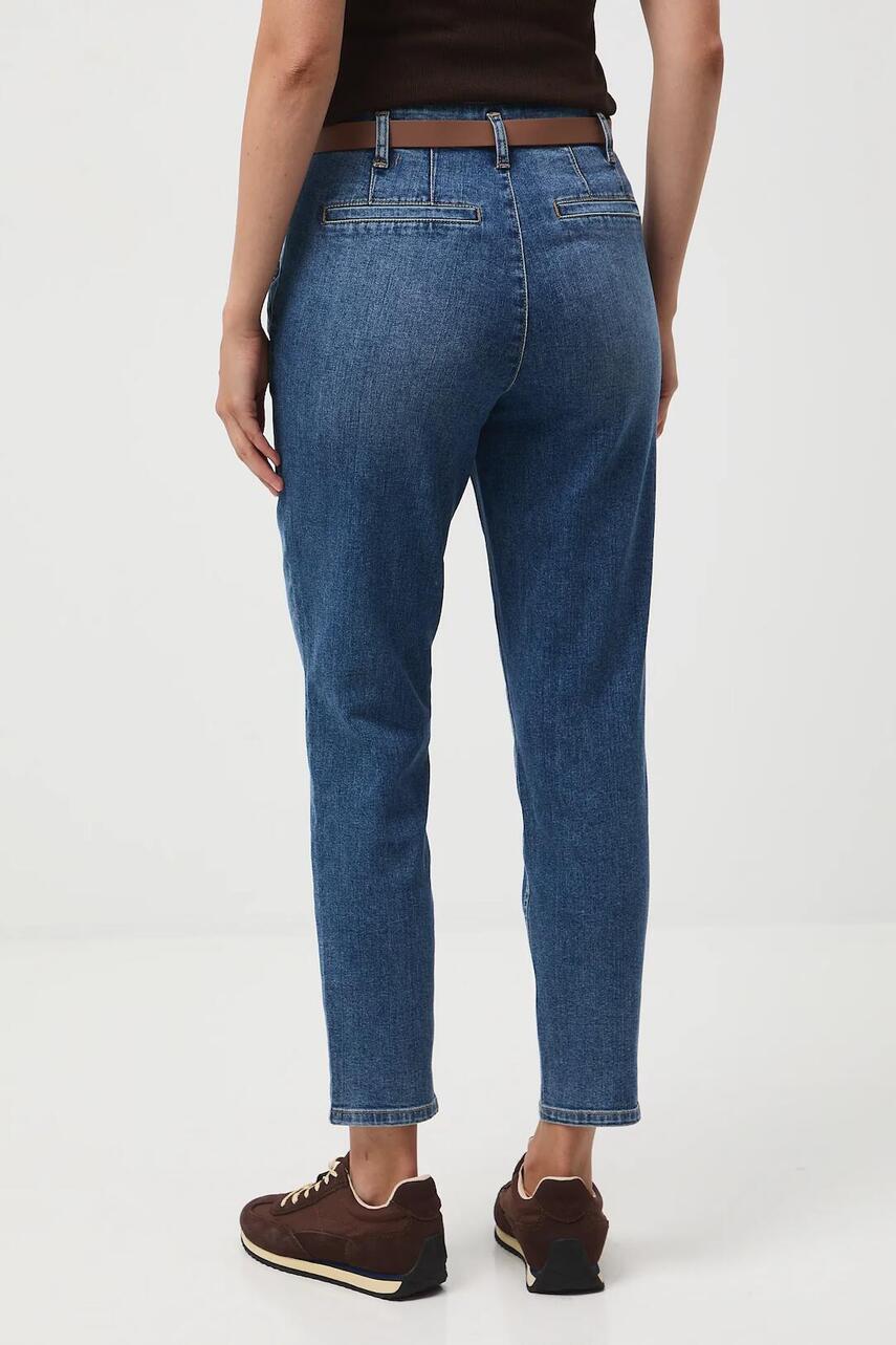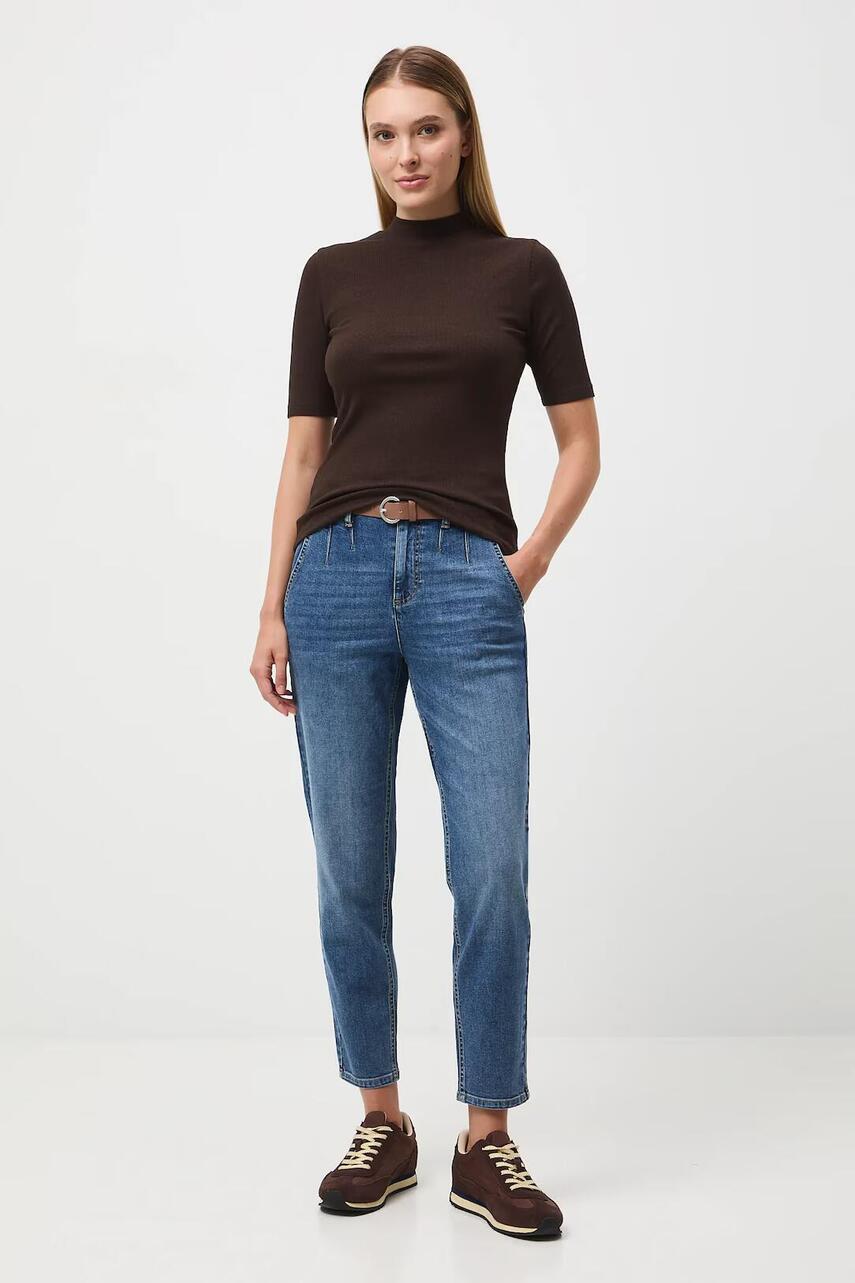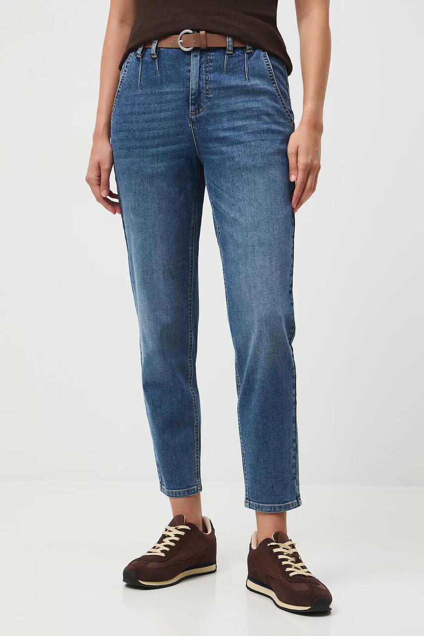 Модель с завышенной талией и застежкой на пуговицы и молнию. - прилагается ремень из экокожи. - прорезные карманы. - деним с декоративными потертостями. - декоративное прострочивание.