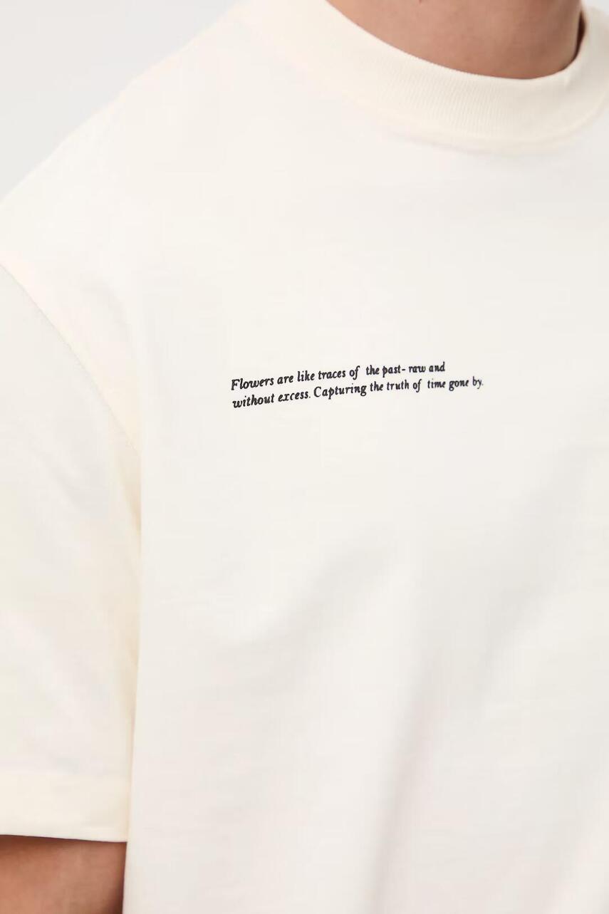 Свободный фасон. - короткий рукав. - заниженная линия плеч. - круглый, ребристый вырез. - модель с принтом на груди и спине. - На передней части напечатанный текст: Flowers are like traces of the past - raw and without excess. Применение truth of time gone by. - принт с растительным мотивом. - декоративное просрочивание. - Нежная, мягкая и дышащая ткань baby terry.