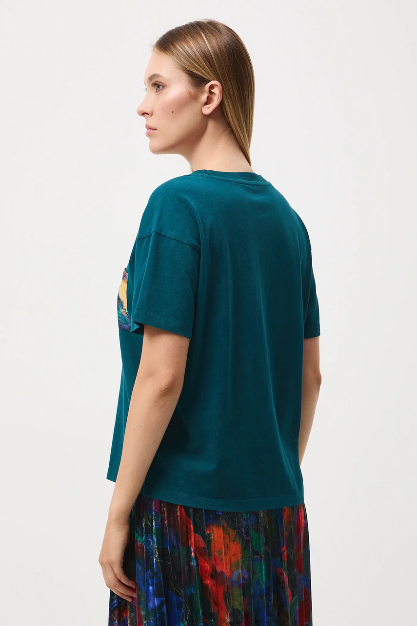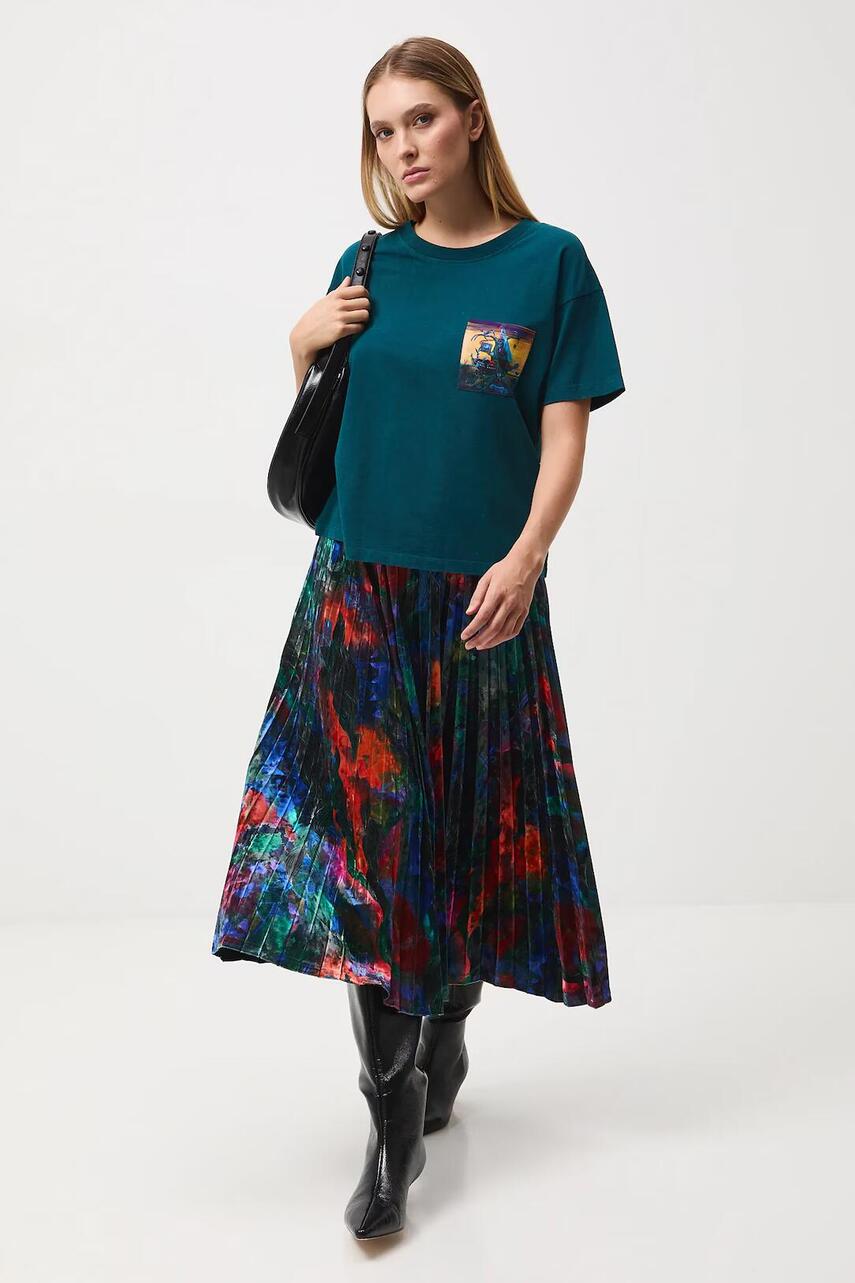 Крой oversize. - короткий рукав. - заниженная линия плеч. - круглый, ребристый вырез. - Принтованный карман на бюсте.