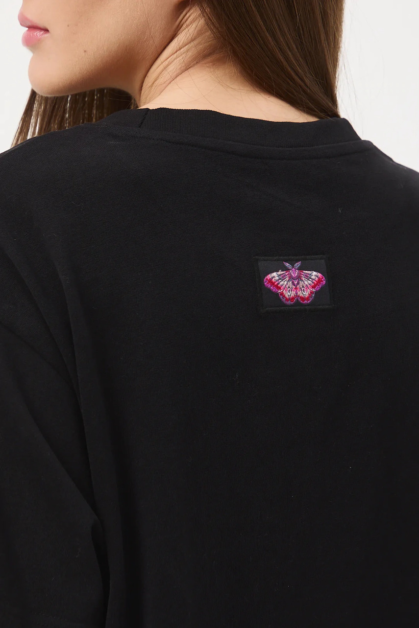 Крой oversize. - короткий рукав. - заниженная линия плеч. - круглый вырез. - модель с принтом и декоративной вышивкой. - декоративная нашивка. - Трикотаж heavy weight с более грубым, плотным переплетением. - Нежный, мягкий и приятный на ощупь трикотаж.