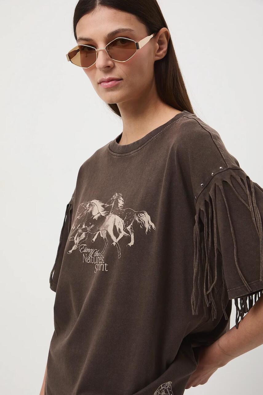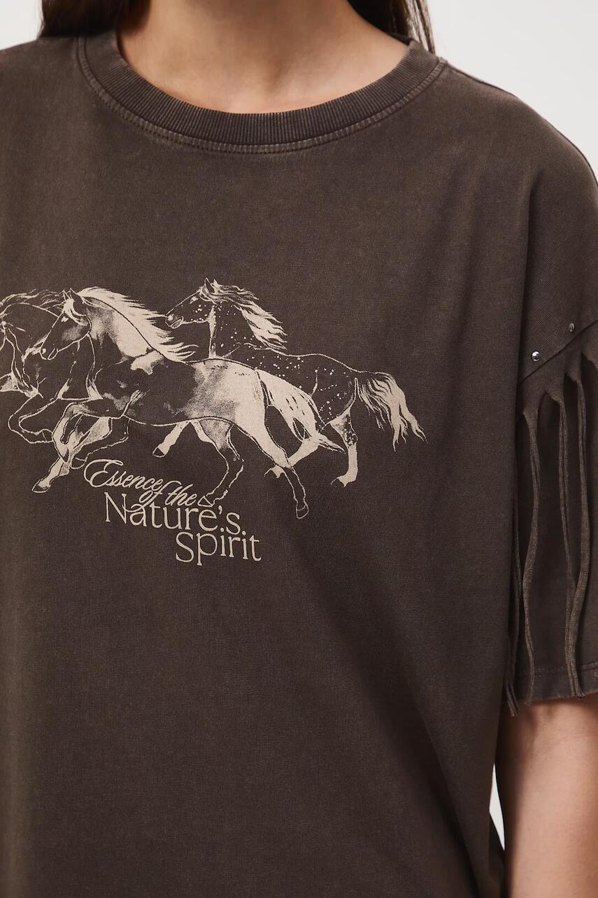 Крой oversize. - короткий рукав. - заниженная линия плеч. - круглый вырез. - модель с декоративными кистями. - модель с декоративной аппликацией из джетов. - принт с животным мотивом. - На передней части напечатан текст: Essence of the Nature's spirit. - модель с декоративной вышивкой. - ткань с эффектом постиранности.