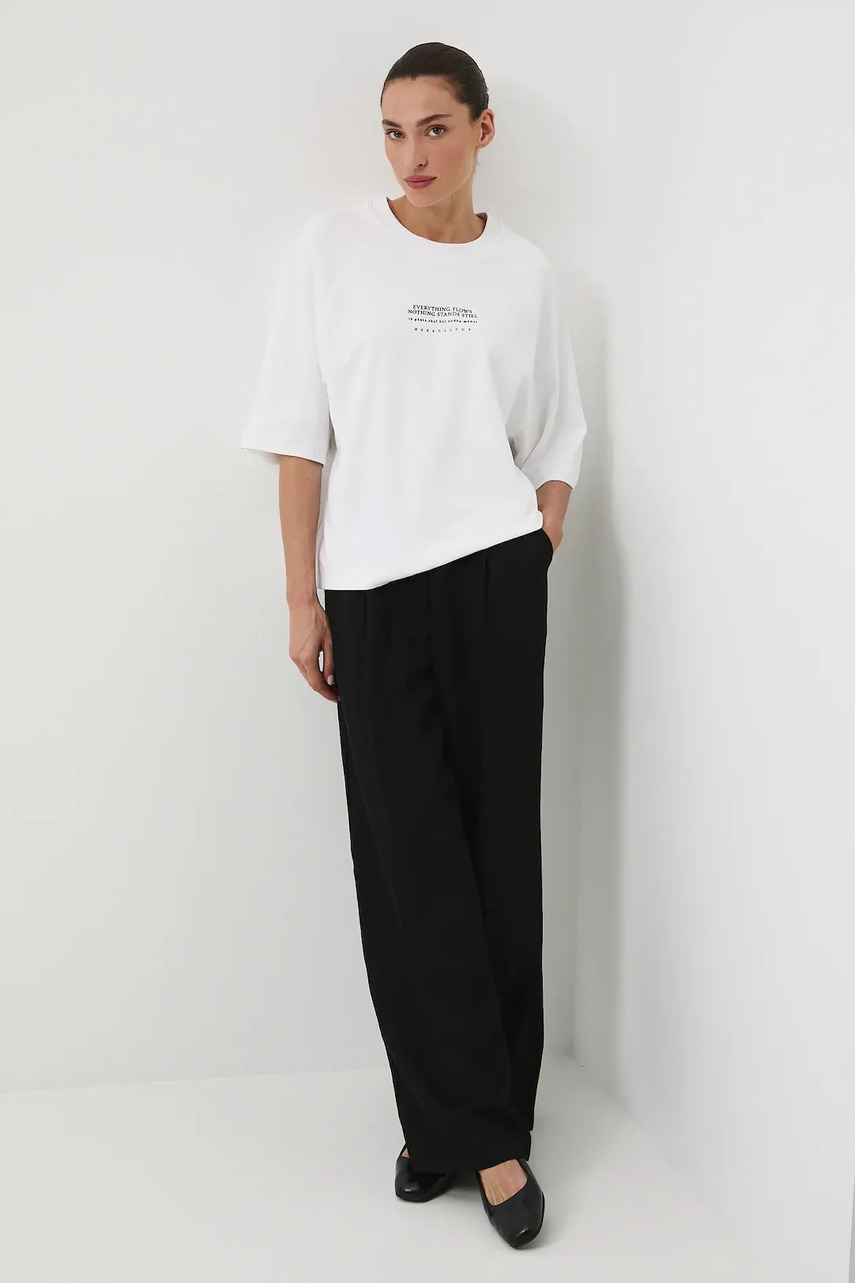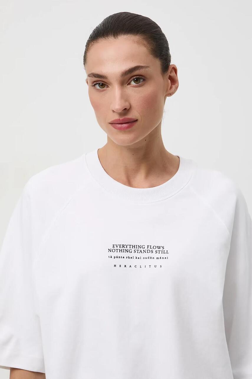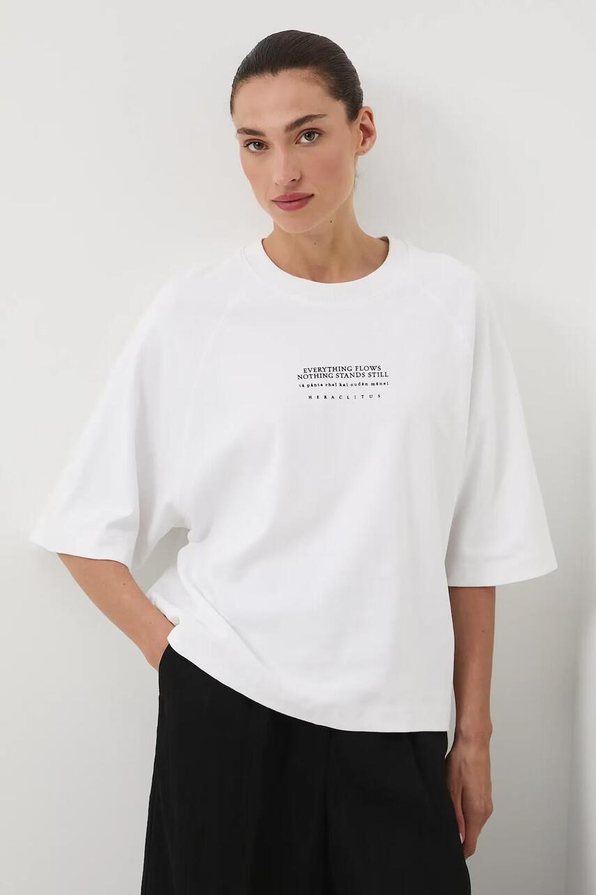 Крой oversize. - короткий рукав-реглан. - круглый, ребристый вырез. - модель с принтом на груди и спине. - хлопковый трикотаж interlock с плотным переплетением.