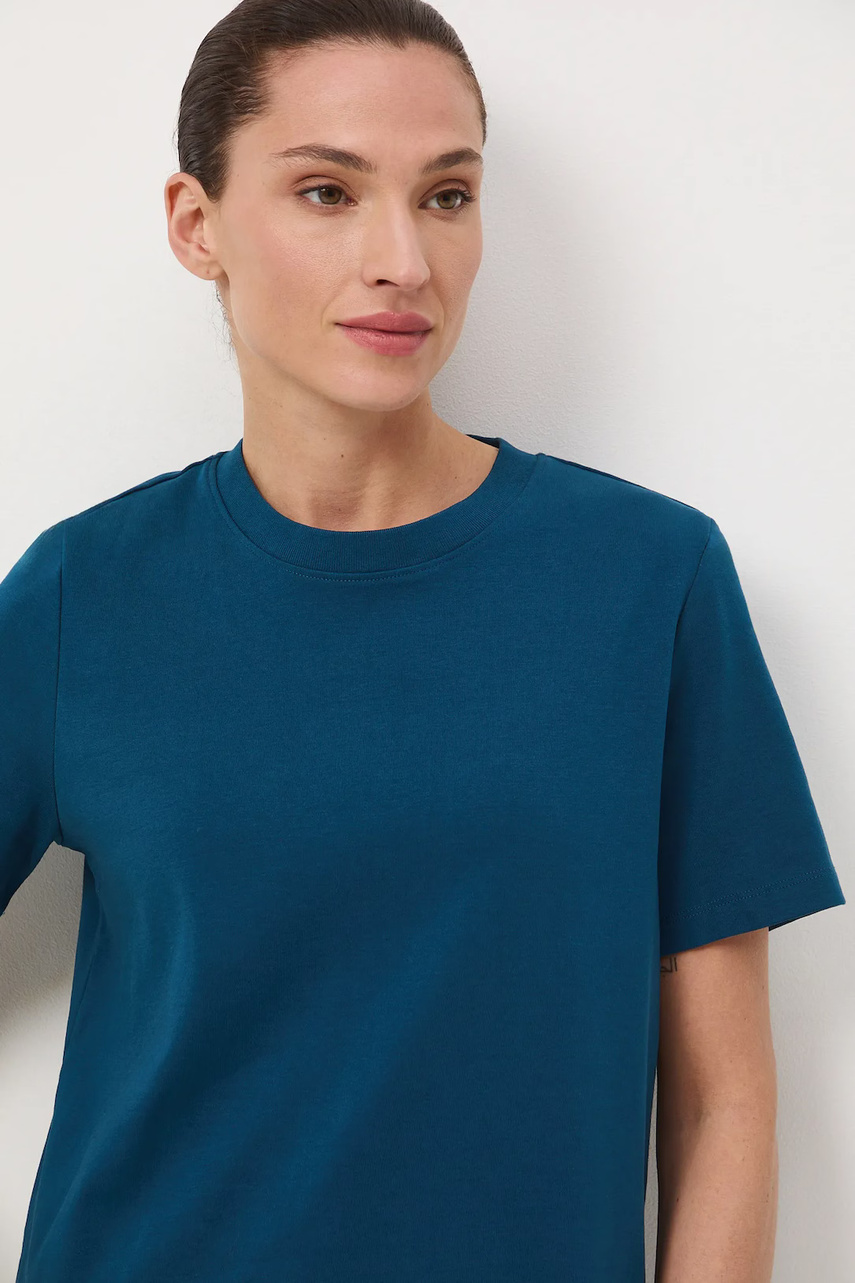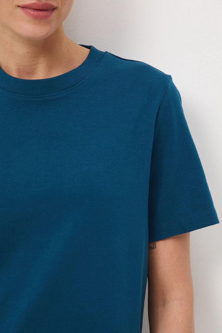 Крой regular. - короткий рукав. - Круглый, ребристый Вырез. - хлопковый трикотаж interlock с плотным переплетением. - гладкий трикотаж.