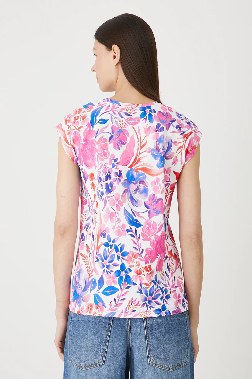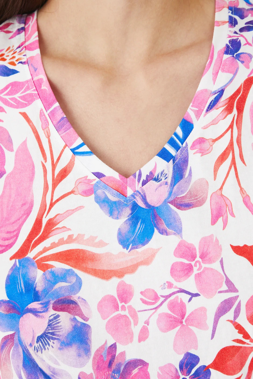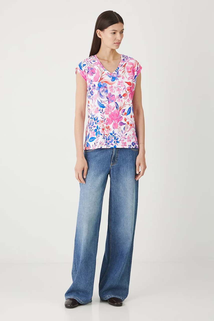 Крой regular. - короткий рукав-кимоно. - V-образный Вырез. - принтованный трикотаж. - цветочный узор.