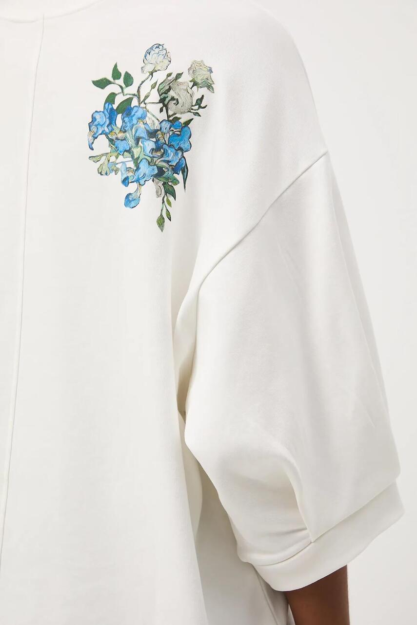 Крой oversize. - короткий рукав. - заниженная линия плеч. - круглый, ребристый вырез. - модель с принтом. - модель с декоративной вышивкой. - хлопковый трикотаж interlock с плотным переплетением. - цветочный мотив.