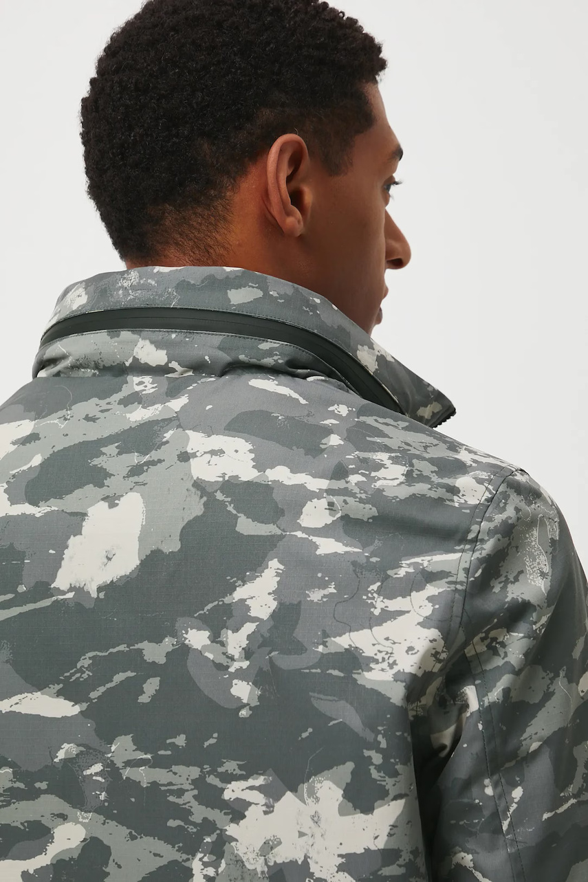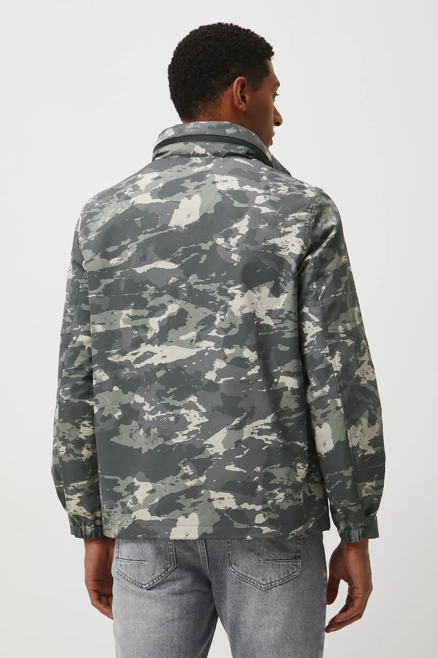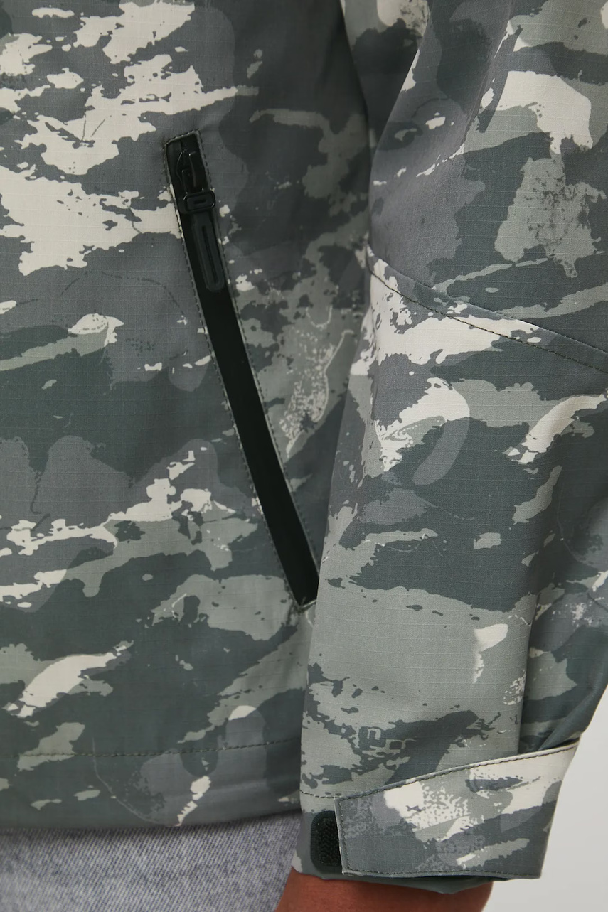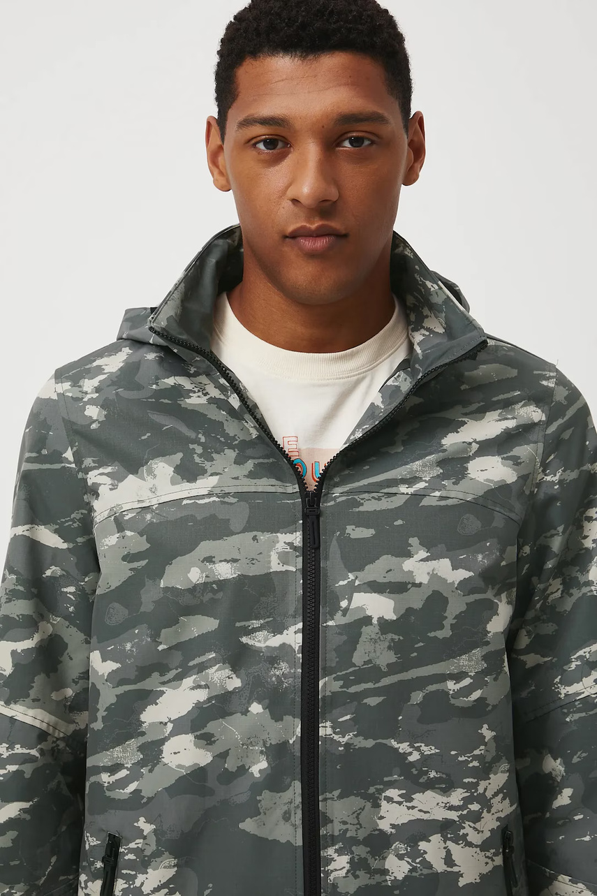 Прямой фасон. – застёгивается на молнию. - завышенный воротник. - Модель с капюшоном, которая легко прячется в воротник на молнии. - нижние края рукавов с завязками и регулировкой на липучках. - Два боковых кармана на молнии. - Внутренний карман на липучке. - модель без утепления с подкладкой. - принтованный материал.