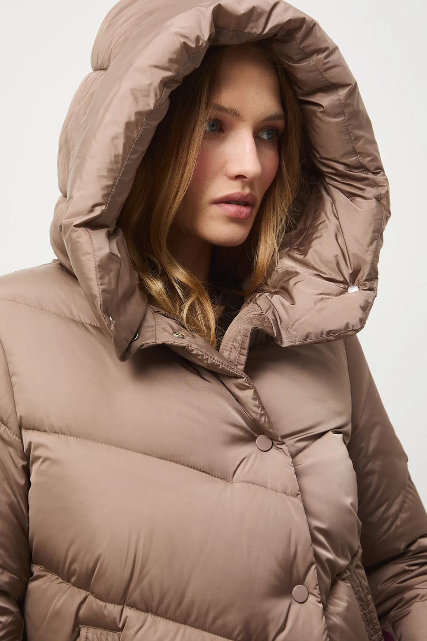 Крой oversize. - застежка на молнию и кнопки. - завышенный воротник. - модель с капюшоном. - Два прорезных боковых кармана. - утепленная модель с подкладкой. - наполнитель – натуральный пух и перо.