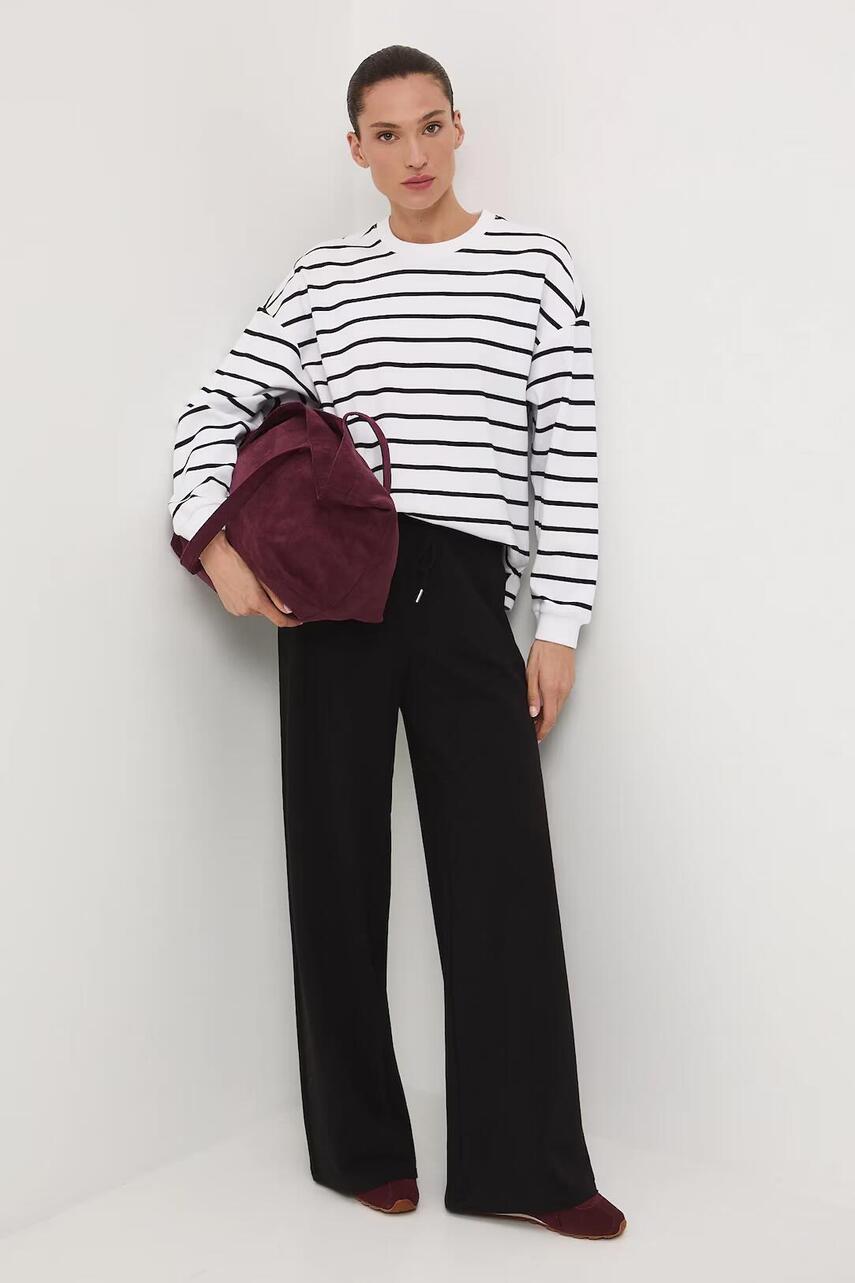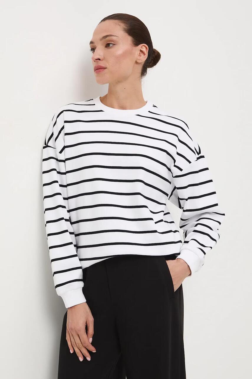 Крой oversize. - длинный рукав. - заниженная линия плеч. - круглый, ребристый вырез. - Рукава со стяжкой. - хлопковый трикотаж interlock с плотным переплетением. - полосатый узор.