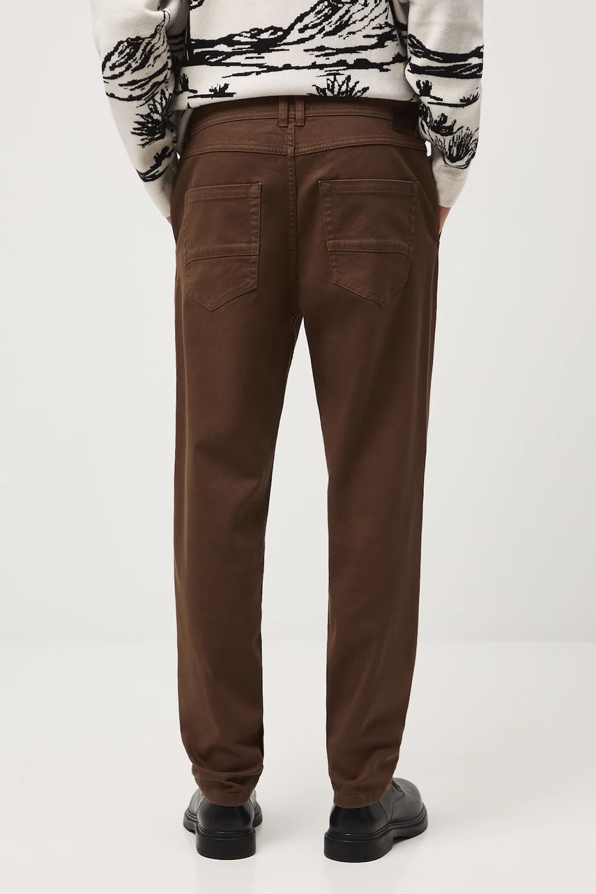 Фасон chino. - Для брюк характерны косые карманы – они идеально вписываются в стиль smart casual. - Модель с регулярной талией и застежкой на пуговицы и молнию. - Прорезные карманы. - ткань с саржевым переплетением. - гладкая ткань.