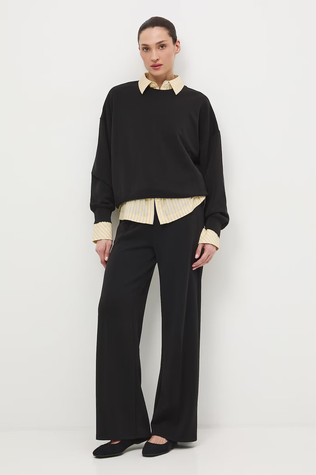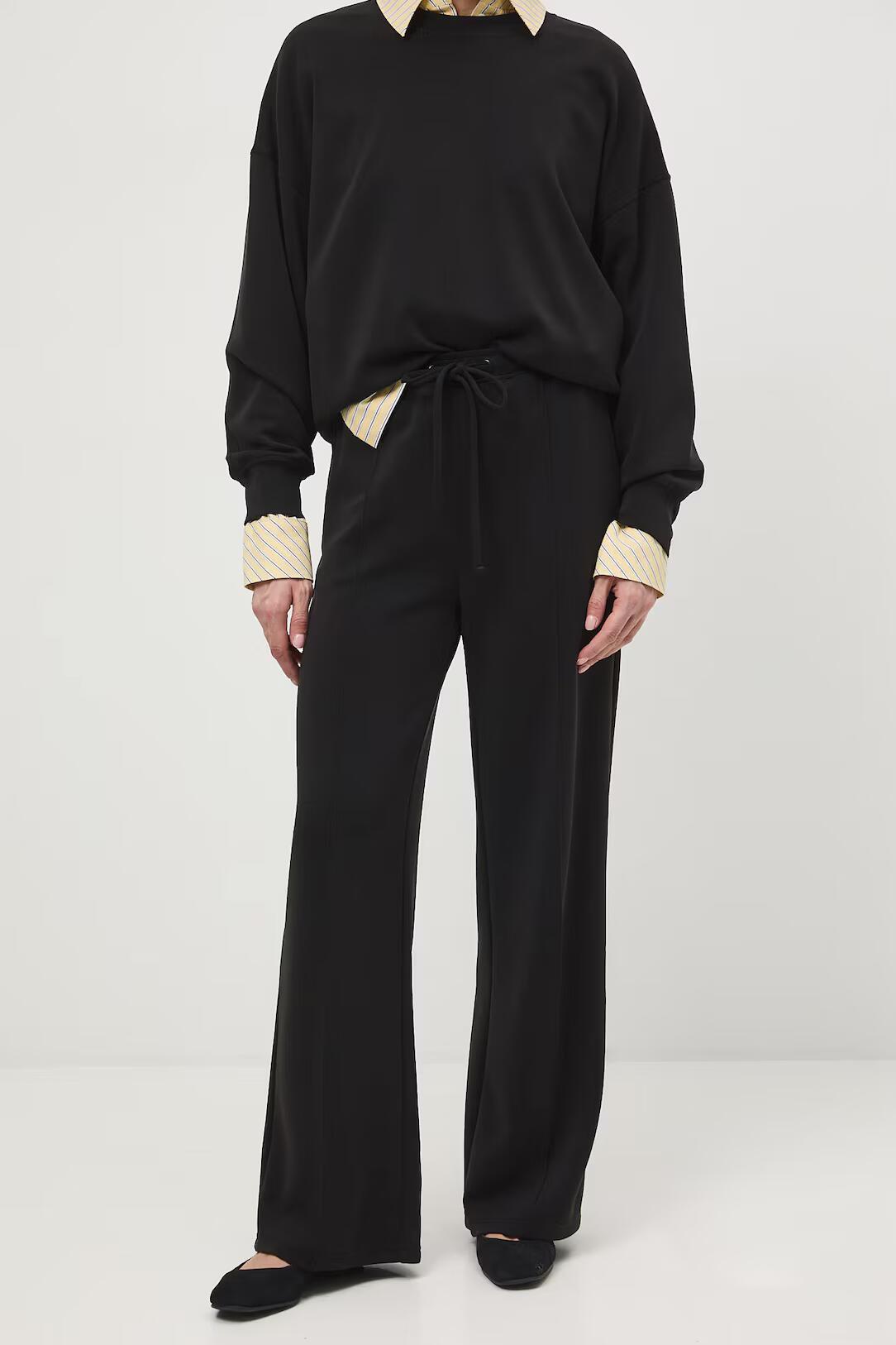 Фасон: wide leg. - повышенная талия. - на талии резинка со шнуровкой. - широкая штанина. - декоративное просрочивание. - гладкий трикотаж.