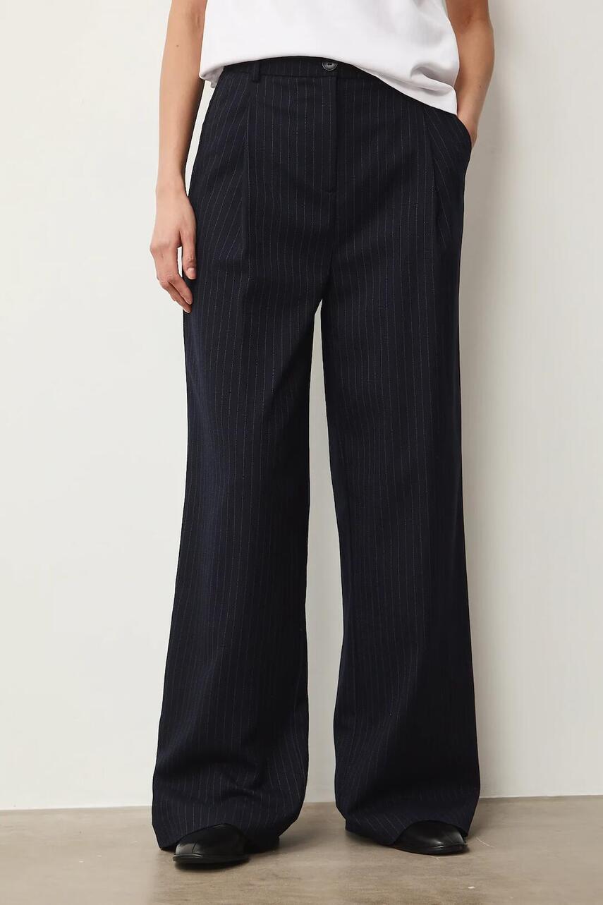 Фасон: wide leg. - Талия регулярно. - застегивается на пуговицу и молнию. - Два прорезных боковых кармана. - широкая штанина. - модель со складками. - полосатый узор.