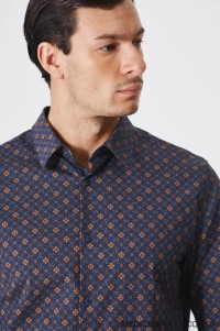 Рубашка фасона regular деликатно прилегает к фигуре, но слишком ее не подчеркивает, обеспечивая свободу движений. - длинный рукав. - Манжеты на пуговицах. - классический, слегка уплотненный, воротник kent. – застёгивается на пуговицы. - ткань с мелким узором. - абстрактный узор.