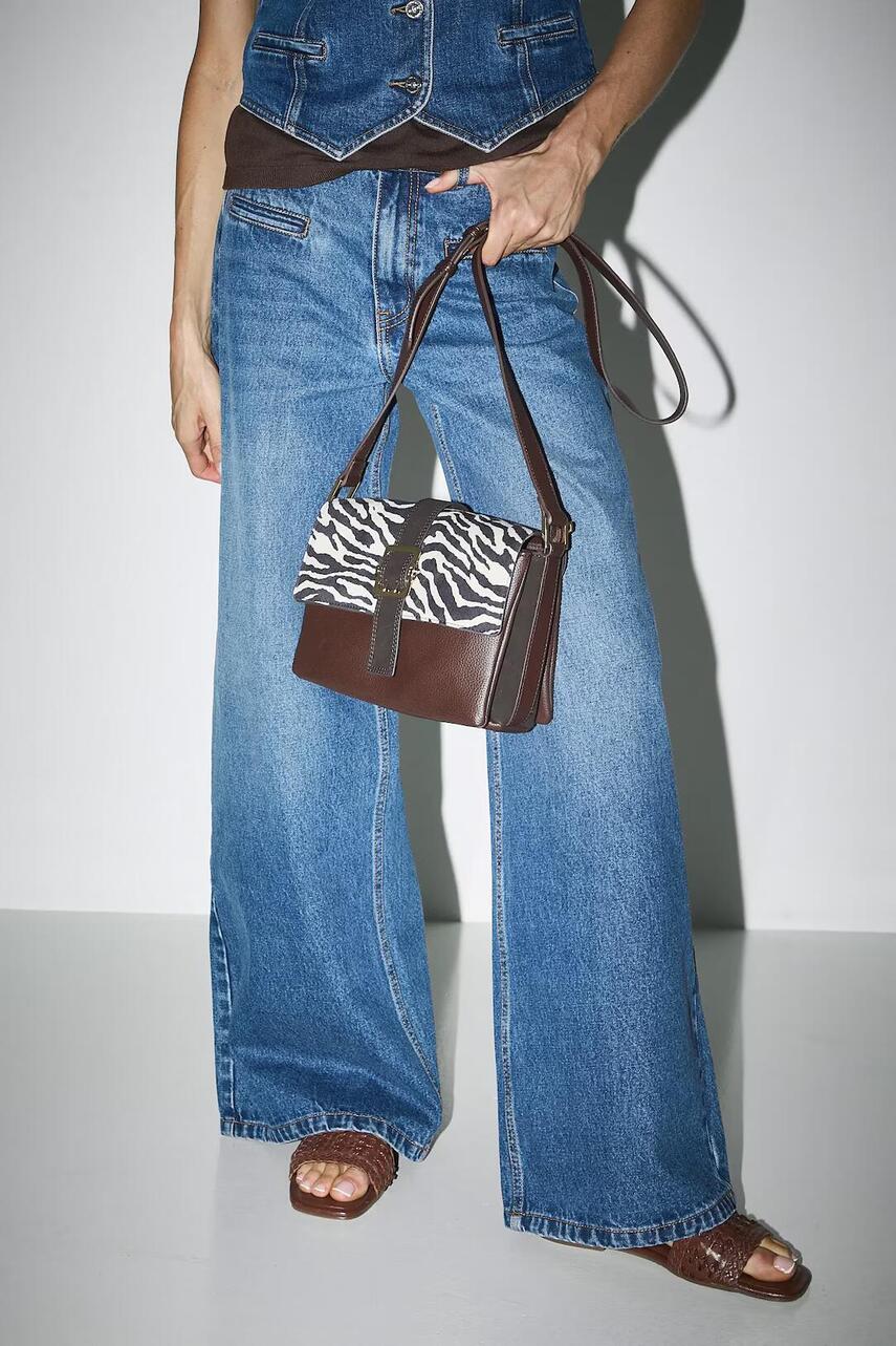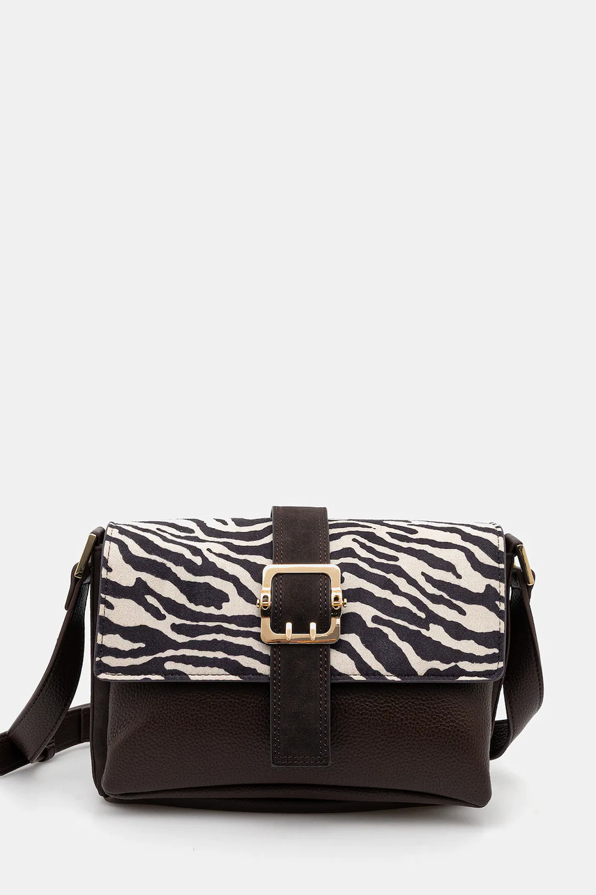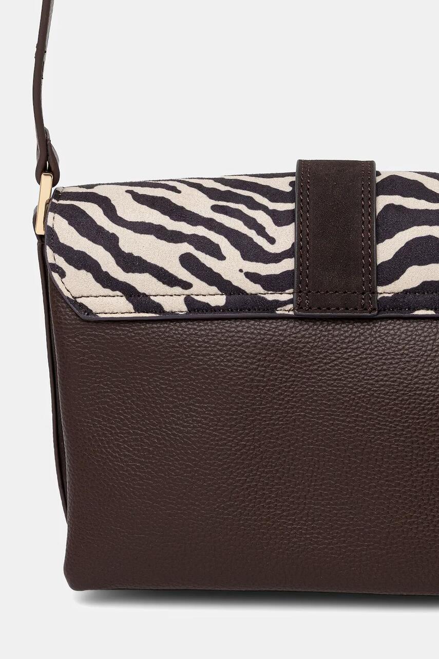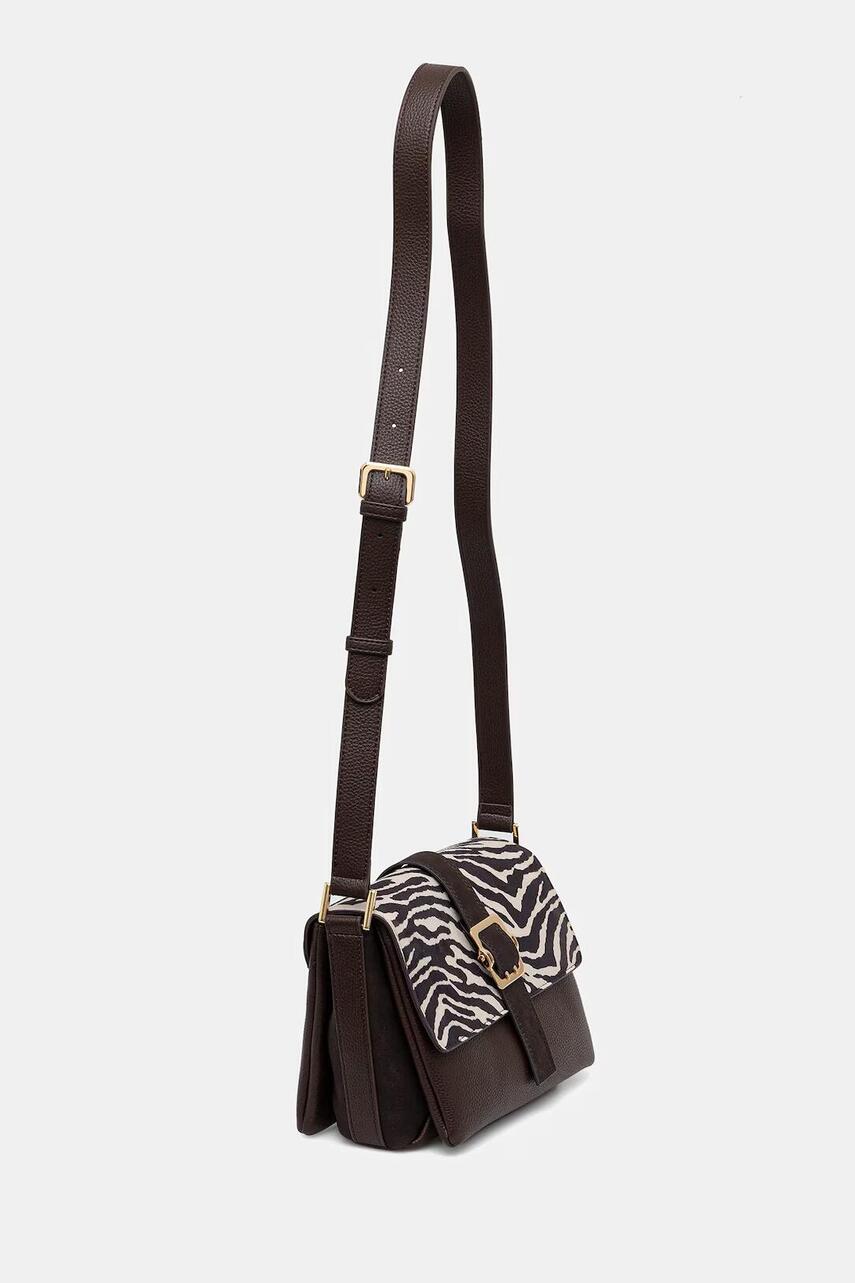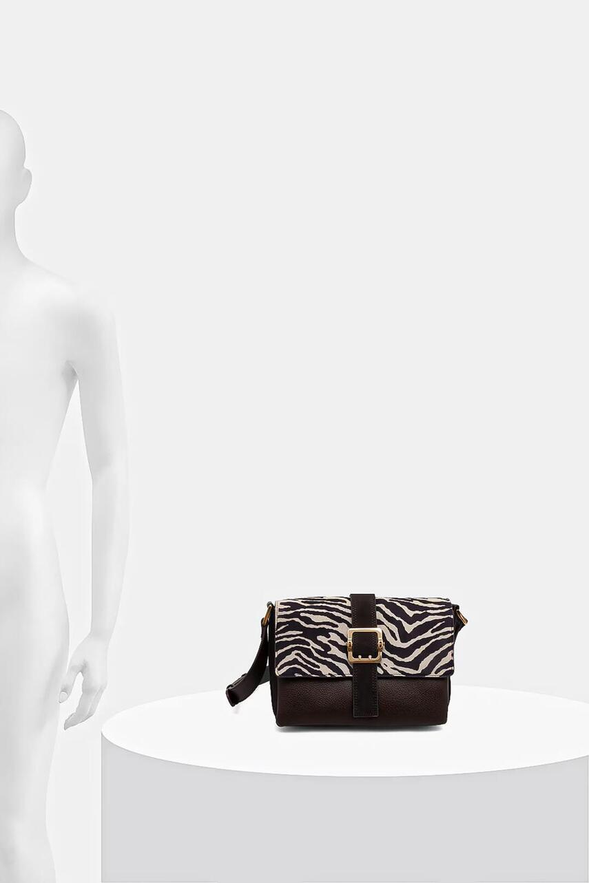 Отделение застегивается на магнит. - Имеет три отделения: одно застегивается на молнию, два других – на магнит. - Внутренний карман на молнии. - регулируемый несъемный ремень. - узор в виде зебры. - модель с подкладкой. - не рассчитана на формат А4.